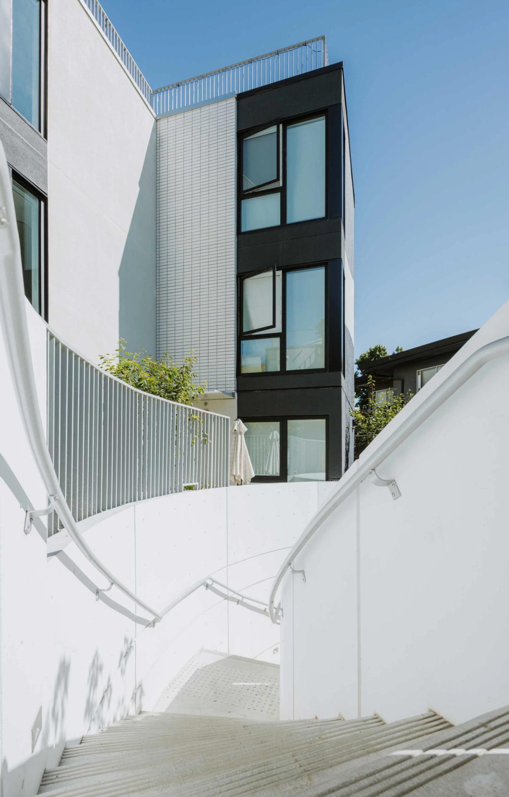 - Unique angled architecture enhances private outdoor spaces and enriches the green courtyard.