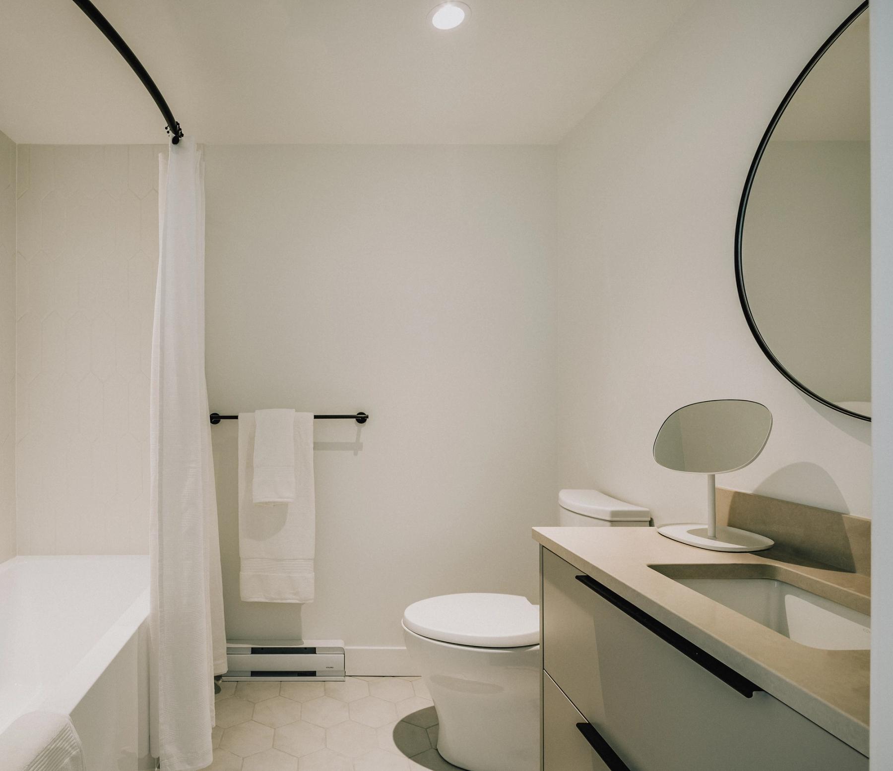 - Matte black faucet and shower/tub fixtures.